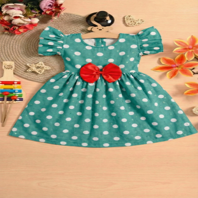 The beautiful green base with white polka dots and an attractive red bow adds a cute and eye-catching appeal. The fit & flare design gives a perfect flowy look, making it ideal for birthday parties, outings, and special occasions.